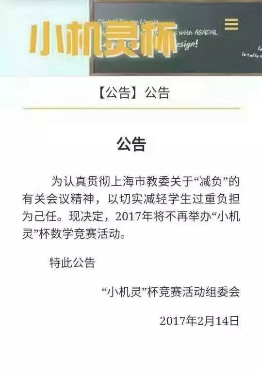 2月14日,小机灵杯赛事组委会在官方网站上贴出公告:“为认真贯彻上海市教委关于‘减负’的有关会议精神,以切实减轻学生过重负担为己任。现决定,2017年将不再举办‘小机灵’杯数学竞赛活动”。