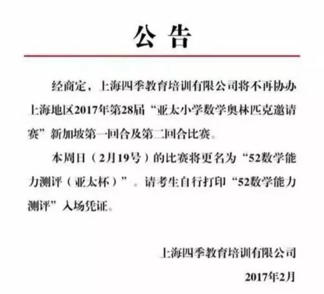 而就在之前,上海四季教育培训有限公司发布公告,将不再协办上海地区2017年第28届“亚太小学数学奥林匹克邀请赛”新加坡第一回合及第二回合比赛,2月19日的比赛将更名为“52数学能力测评(亚太杯)。”亚太杯小学数学奥林匹克邀请赛是从新加坡小学数学奥林匹克竞赛演变而来,从1990 年开始每年举办一次。