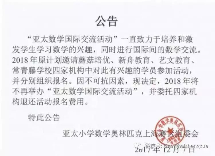 与此同时,“走进美妙的数学花园”上海组委会也宣布:原定于2018年1月7日举办的第十六届“走进美妙的数学花园”青少年展示交流活动(俗称“走美杯”)上海赛区初赛活动将不再举办,今后也不再举办类似学科及其延伸类赛事。对已经报名的学生,将全额退款。