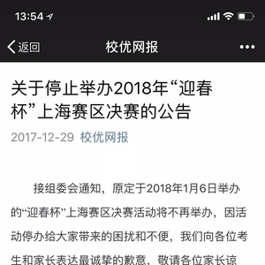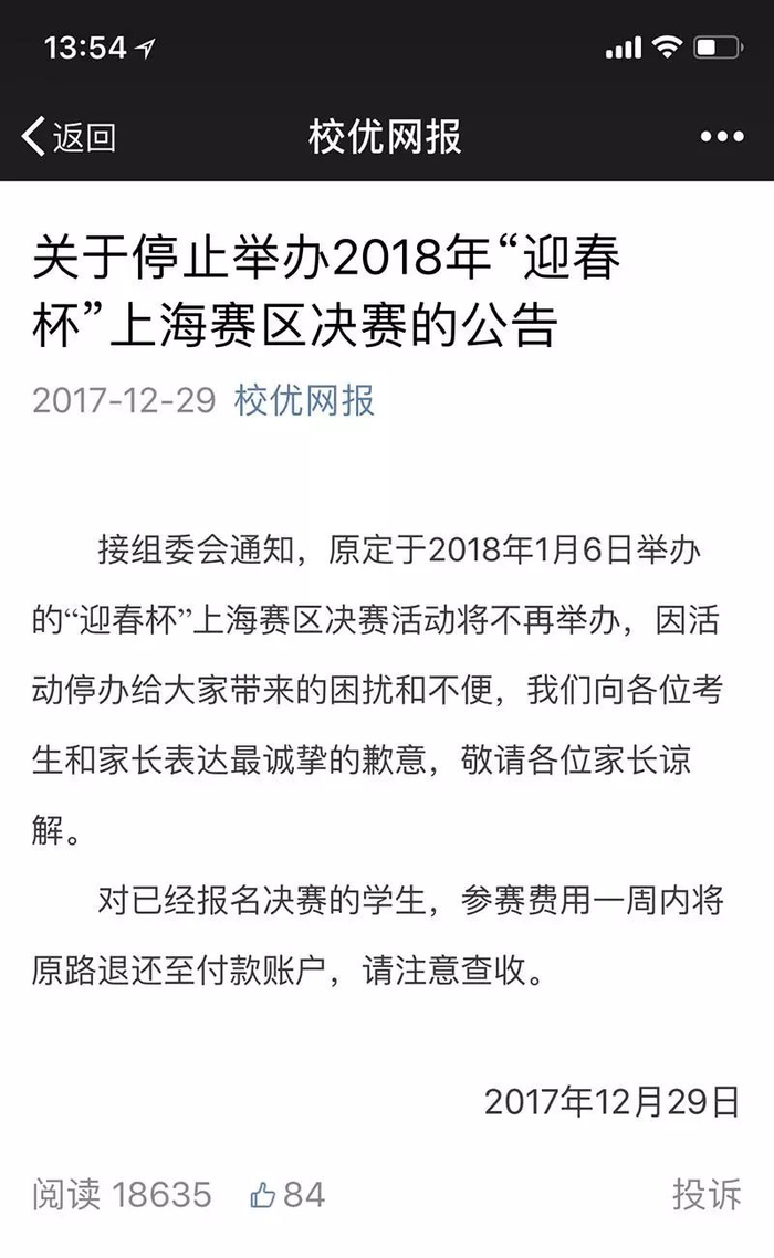今天,相关网站发布“关于停止举办2018年‘迎春杯’上海赛区决赛的公告”。该公告称,按组委会通知,原定于2018年1月6日举办的“迎春杯”上海赛区决赛活动将不再举办。对已经报名决赛的学生,参赛费用一周内将原路退还至付款账户。
