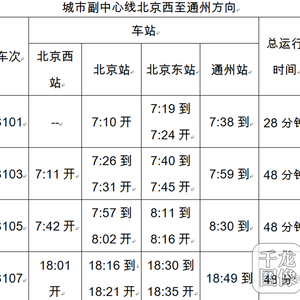 城市副中心线每日开行北京西(北京)站至通州站市郊列车4对,其中早间开行北京西(北京)站至通州站3列、通州站至北京西站1列;晚间开行通州站至北京西(北京)站3列、北京西站至通州站1列。