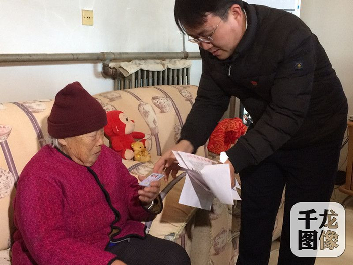 12月28日下午,北京市大兴区庞各庄镇宋各庄村民阮淑芬和公公、婆婆一家3口,从北京市大兴区人力社保局工作人员接过社会保障卡。图为北京大兴区人力社保局工作人员,给80岁的贾淑文老人介绍社会保障卡的用途。千龙网记者 于振华摄