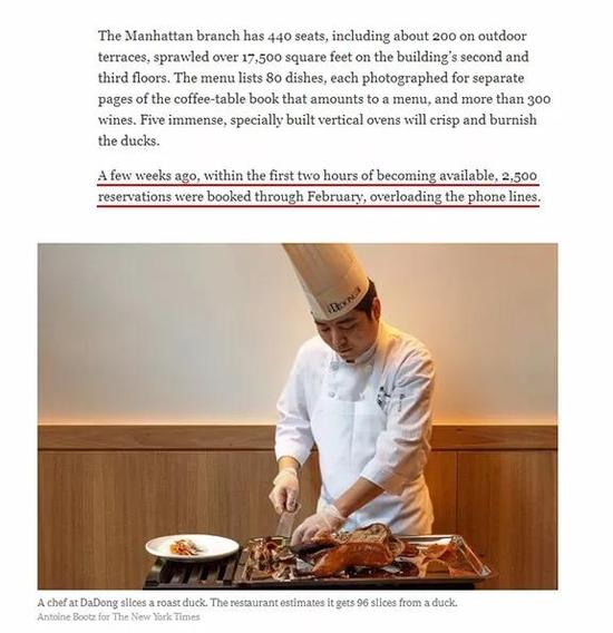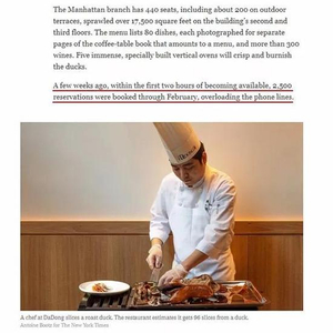 马上就到新年了,今天我们来聊点轻松愉悦的话题。近日,著名的北京烤鸭品牌大董,首家海外分店在纽约开张。据《纽约时报》11月份的报道称,预定开始后两个小时,餐厅就收到2500张订单,定位排到了明年2月。