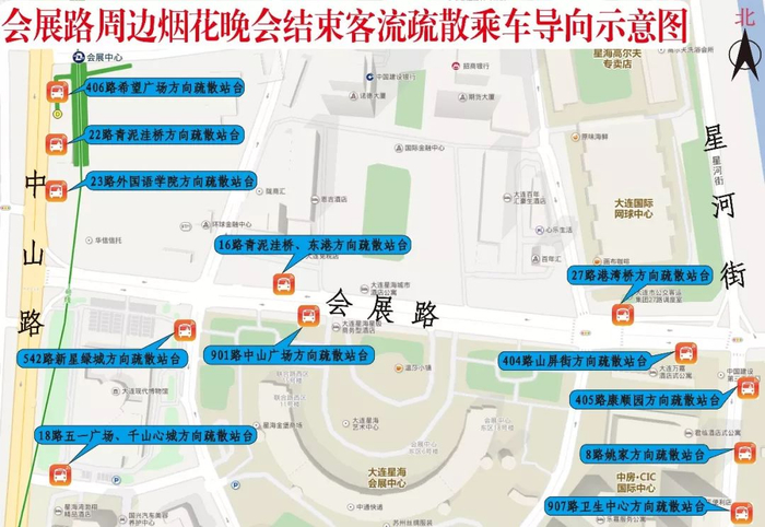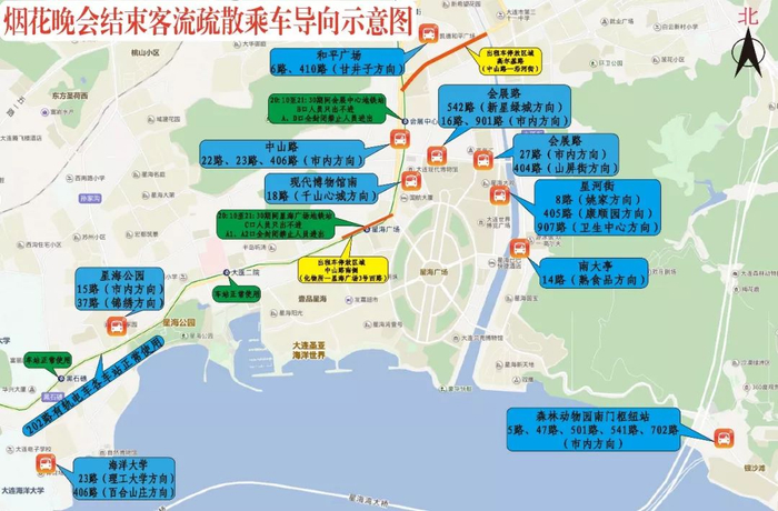烟花晚会结束后,在和平广场枢纽站、中山路(会展中心地铁站)、会展路东段、会展路西段、现代博物馆南、星河街、南大亭、星海公园、海洋大学、森林动物园南门等10处公交站、枢纽站和重点路街,设置临时疏散公交站点,涉及18路、23路、27路等24条线路,行驶方向及地理位置详见示意图: