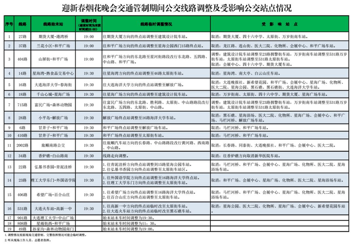 404路:19:00起,往和平广场方向的东北路路段改行东北路、五四路、中山路、和平广场,建筑设计院车站临时调整至23路拥警街车站、万岁街南车站临时调整至531路万岁街车站、太原街车站临时调整至531路太原街车站。临时取消会展中心、四十六中学、期货大厦车站。
