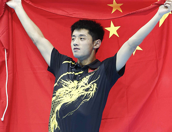 2012年伦敦奥运会,张继科身披国旗庆祝。 本文图均为 视觉中国 资料图