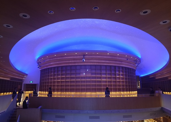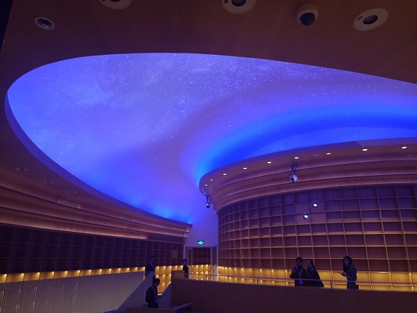 “安藤蛋”的顶端还安装了巨型屏幕,现在投影的是星空图像,取德国哲学家康德“头顶的星空”和“内心的道德法则”之意。