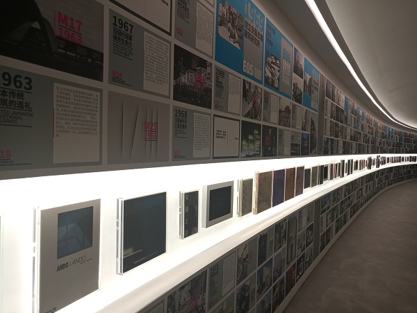 从明珠美术馆随旋梯可进入书店内场。目前美术馆中的安藤忠雄展设计有多个部分,包括“光的空间”新华书店的设计建筑过程展示、建筑模型、摄影作品以及艺术品的展示等。