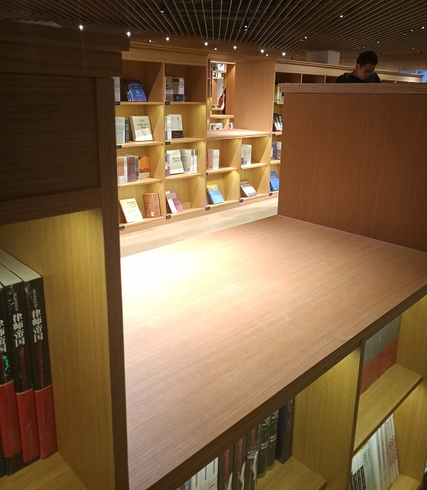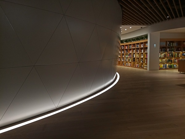 在“光的空间”新华书店中,光的运用除了体现在书柜灯箱和顶部投射灯的设计外,更多体现在外场中对自然光的运用。