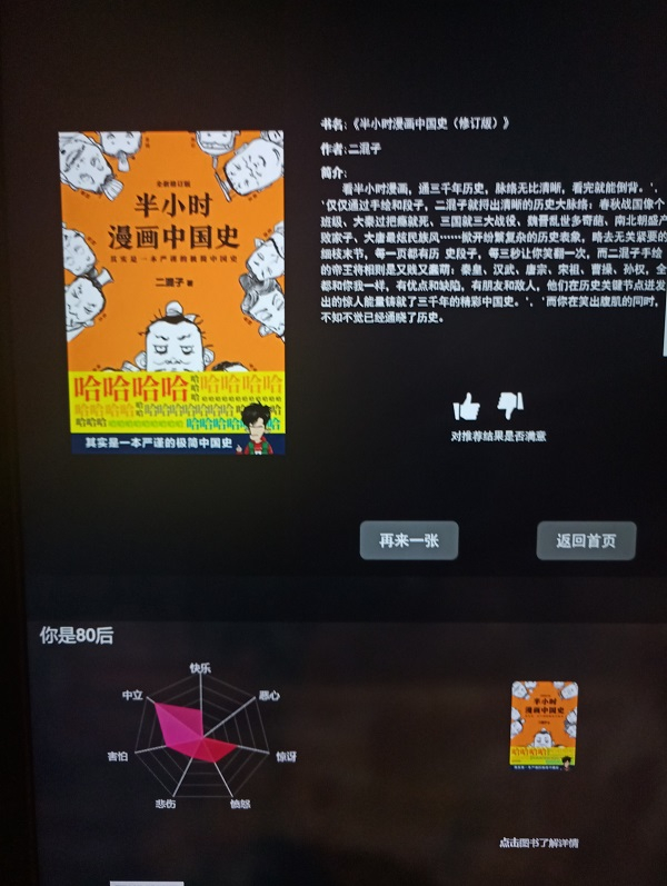 外场中还有可供读者搜索图书和帮助读者智能荐书的电子屏幕。读者可以搜索书名或作者名,获得某本图书的架位信息。智能荐书可以通过脸部识别、涂鸦和心理测试来为读者推荐图书。