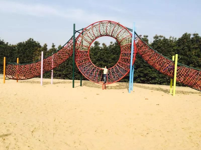 其次是园区内的各项游乐设施,大大的儿童游乐园非常醒目,滑梯、绳索攀爬、旋转木马这些常见项目都有,适合学龄前的孩子。但很多人不知道的是,东方绿舟儿童游乐区再继续往里走,还有一大片可供大点的孩子以及成年人玩的拓展区。拓展区里各种绳索攀爬、翻越木栏等的项目,即使是大人也能玩得不亦乐乎。