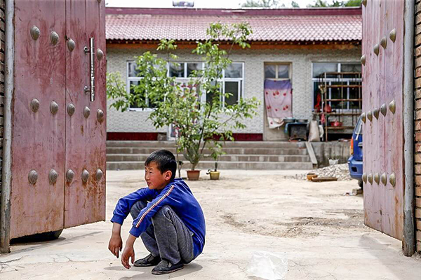 王民中学五年级的学生马未军(化名)蹲在自家门口。