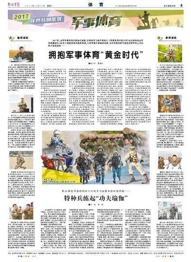 2017年,全军军事体育训练如火如荼,训练改革力度不断加大,《军事体育训练大纲》试训任务在全军和武警部队300多个旅团级单位稳步推进,大纲草案不断修改完善,全军依托院校专业化培养军体人才的路子越走越宽——