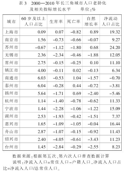 对长三角16城市老龄化的影响因素分析发现,净人口流入较多的城市,老龄化增速较低。例如,2000-2010年间,苏州和上海两个城市净流入人口最多,两个城市净流动人口占常住人口比重增长为长三角地区最高,分别高达24.20和19.32个百分点,与此相伴随的是两个城市的人口老龄化增速最低;同期老龄化增长最快的镇江、扬州、南通和泰州四个城市的净流动人口增长最低,特别是后三个城市为人口净流出城市,流动人口负增长。