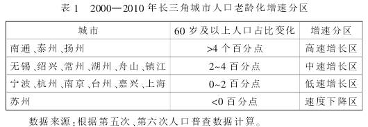 根据2000-2010年间,60岁及以上人口占比变化,可将长三角城市划分为人口老龄化高速增长区、中速增长区、低速增长区以及速度下降区四个区域。