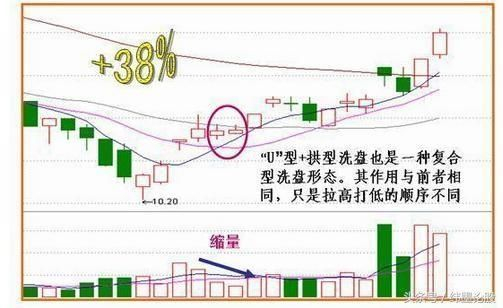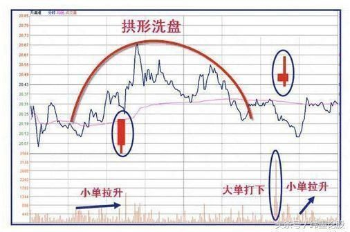拱型洗盘是指股价全天走出一种:低开--高走--再低收的分时走势。盘口特征多为小单拉高、大单打低,打低的目的是为了吓出获利盘,上下买卖均成小单景象。