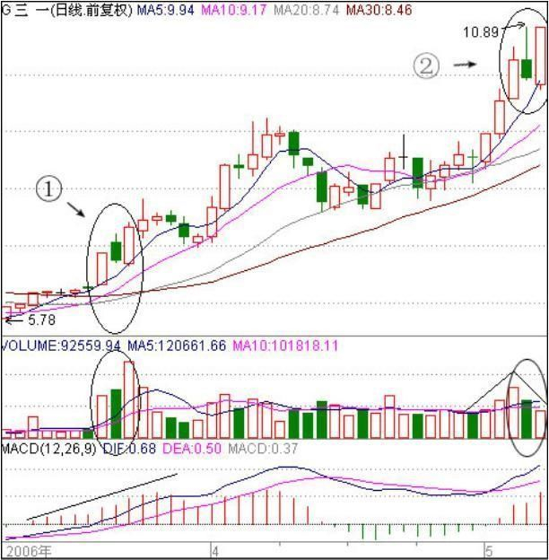图中①处的K线组合是属于低位首次启动进攻信号,注意①处出现的K线组合成交量,和②处的K线组合相比,后者明显是缩量的。经过一定涨幅之后再度出现的“两阳夹一阴”K线组合,其进攻的意义就不那么高了,甚至可能是最后一次冲高的信号!