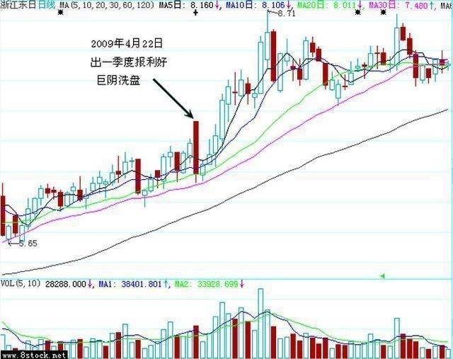 如图,浙江东日600113利用2009年4月22日出一季度报:净利润同比增长28.04%,借助利好洗盘的手法,高开后使用巨阴砸盘,全天振幅11.62%。而在4月23日则快速企稳,完成一日洗盘。