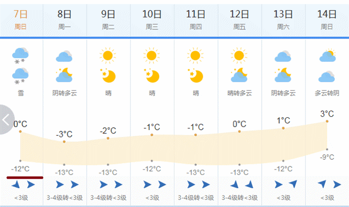今天下午到夜间:全省晴天间多云。最高气温:北部-3~2℃,中部及南部山区2~6℃,南部其余地区6~10℃;最低气温:高寒地区-20℃左右,北部-16~-11℃,中部及南部山区-12~-7℃,南部其余地区-7~-3℃。