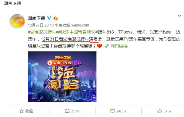 不仅如此,湖南卫视跨年演唱会将首次开启全网直播,除登陆湖南卫视和芒果TV之外,腾讯视频、爱奇艺、优酷也将同步直播。
