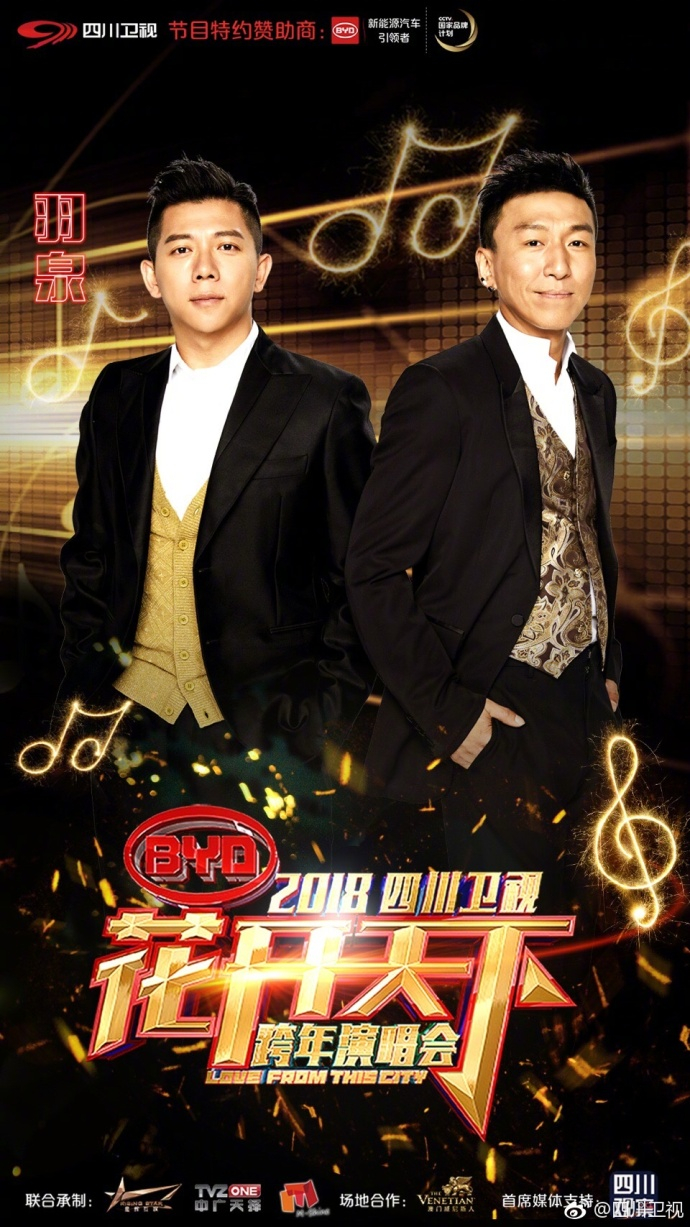 四川卫视跨年晚会的主题为“花开天下”,将于今日20点30分在澳门金光综艺馆举办,并设有成都都江堰分会场。李健、郑秀文、羽泉、张靓颖、黄琦珊、王铮亮等加盟。