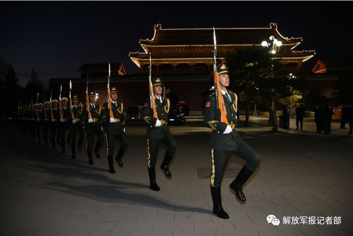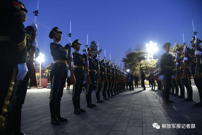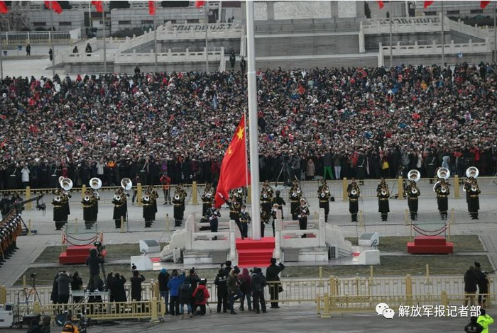 7、调整升旗人员。升旗组由原来的4人调整为3人,分别着陆海空三军礼服,代表全军官兵。着陆军礼服的升旗手执行展旗任务,另外2名着海军空军礼服的护旗兵握枪行注目礼。