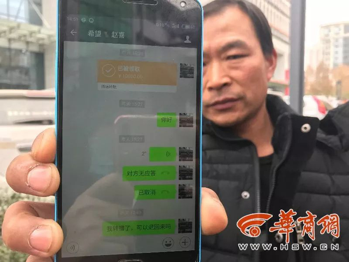 “我就赶紧给微信上给这个陌生网友留言,并给对方说明情况 ,说这是发给10个农民工们回家的路费,希望能退还,对方一直没搭理。当晚9时26分,对方收了钱,我再次发消息,请求将钱退还 ,对方只说‘我不会,爸爸下班了我给他看’,再之后没过多久, 我就被拉黑了。”张师傅很着急。