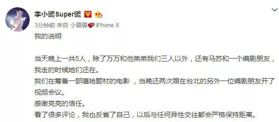 李小璐亲自发文回应,她写道:“我的说明,当天晚上一共5人,除了万万和他弟弟我们三人以外,还有马苏和一个编剧朋友,我走的时候她们还在。我们在筹备一部嘻哈题材的电影 ,当晚还两次跟在台北的另外一位编剧朋友开了视频会议。感谢亮亮的信任。看了很多评论,我也反省了自己,以后与任何异性交往都会严格保持距离。 ”