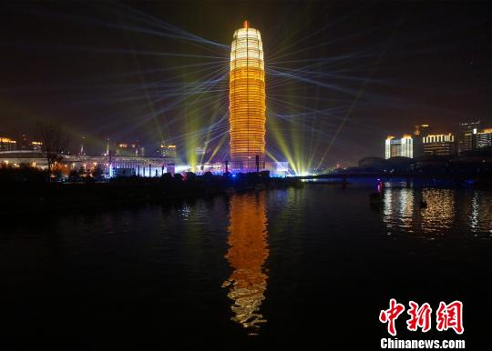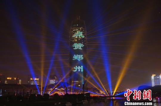 现代感十足的灯光秀一一映射出中原河南的名片,黄河、少林寺、宋代官窑汝瓷钧瓷等画面都出现在城市地标之上。 韩章云 摄