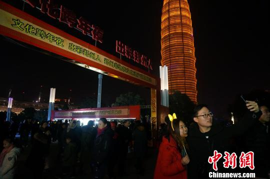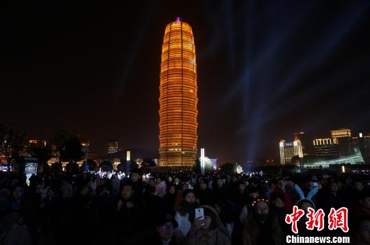 图为众多市民聚集在郑东新区如意湖,以城市地标为背景,迎接2018年的到来。 韩章云 摄