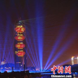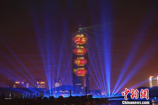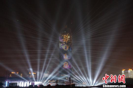 图为郑州新城市地标上演灯光秀,迎接2018年。 韩章云 摄