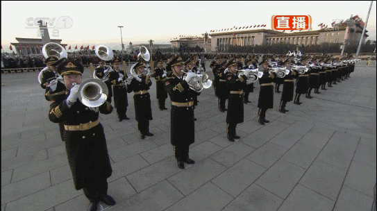 96名陆海空三军护卫着五星红旗,从天安门城楼中齐步走出,伴着嘹亮的号角,踏过金水桥,走向天安门广场。值得一提的是,军乐团乐器进行了改造,在广场演奏时,声音更具穿透力。