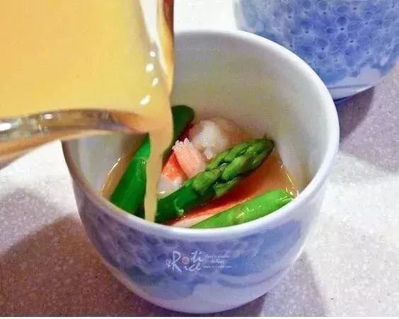 在碗中加入温水,添加酱油、盐和甜酒,放凉,加入鸡蛋,打散成蛋液;将芦笋、虾仁等放入蛋杯中,慢慢倒入蛋液混合物。