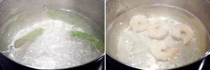 把一小盆水烧开,把芦笋轻煮1至2分钟。捞出后继续在水中加入虾仁煮,直到它们卷曲并变成粉红色。