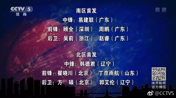 本赛季CBA全明星周末将于1月13、14日在深圳龙岗举行,CBA官网昨天公布了全明星赛先发名单,南区 中锋:易建联;前锋:周鹏、顾全;后卫:赵睿、吴前;北区 中锋:韩德君;前锋:丁彦雨航、翟晓川;后卫:郭艾伦、方硕。其中,易建联以249644票当选票王,而外援没有一人进入先发名单。(@CCTV5)