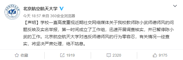 昨晚,北航的官方微博发文回应:第一时间成立工作组展开核实调查,已暂停陈小武工作,对违反师德的行为零容忍。
