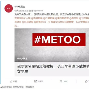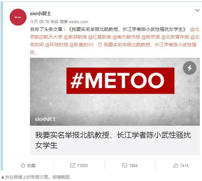 这条微博标题为《我要实名举报北航教授、长江学者陈小武性骚扰女学生》,发布者在文章中表明自己的身份:我叫罗茜茜,北京航天航空大学2000级本科,2004年直博,2011年博士毕业,现旅居美国。