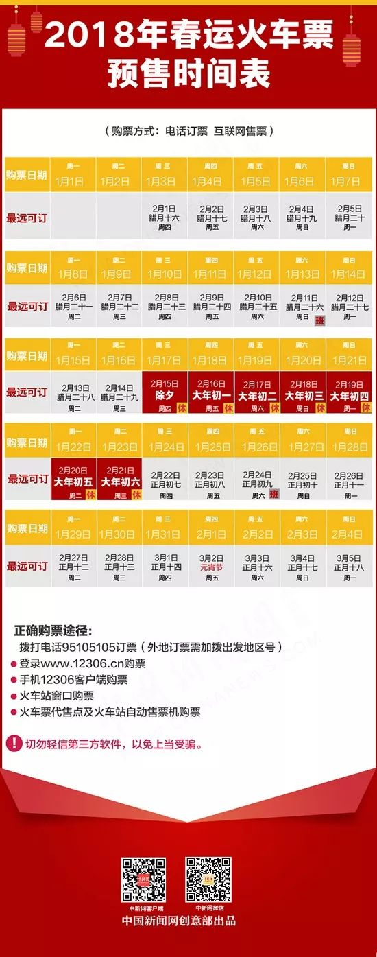 根据中国铁路总公司编制的“2018年铁路春运购票日历”,2018年春运自2月1日开始,3月12日结束。1月3日,春运首日火车票将正式开始预售。