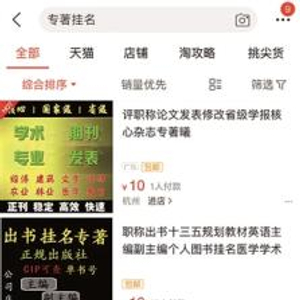 北青报记者随后在淘宝平台上输入“专著挂名”的关键词后,搜索发现标有“出书挂名专著,正规出版社”“出书、挂名专著教材出版”等字样的商家迅速出现在页面上,不下百家。据粗略梳理,这些商家打出可出书挂名专著涉及医疗、教育、旅游、外国文学、经济学等数十个学科。其中部分商家在网页广告中就明确表示,“很多作者评职称的时候需要出书,但是自己又没时间写书,这个时候可以找到我们,我们为您寻找对应专业合适的书籍让您在书中担任主编、副主编或者编委,同样能达到评职称的目的。”