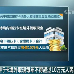 可就在30日,国家外汇管理局发布了《国家外汇管理局关于规范银行卡境外大额提取现金交易的通知》(以下简称<通知>),其中规定,个人持境内银行卡在境外提取现金的额度,每个自然年度将不超过等值10万元人民币。