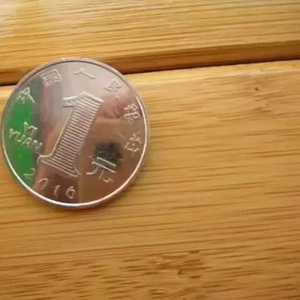 用一元硬币来辅助测量,看硬币背面,将硬币直立、且背面花图案的根部一侧放入胎面凹槽处: