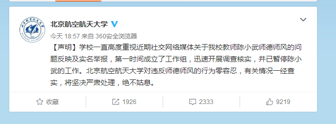 @北京航空航天大学 发布声明:学校一直高度重视近期社交网络媒体关于我校教师陈小武师德师风的问题反映及实名举报,第一时间成立了工作组展开调查,并已暂停陈小武工作。有关情况一经查实,将坚决严肃处理。
