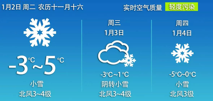 2日是2018年上班第一天,但早上前后有雾,傍晚到夜间局地有零星小雪。根据预报2日-4日,6日-7日都将有小雪过。根据济南市气象台预报,2日多云,早晨前后有轻雾或雾傍晚到夜间部分地区有零星小雪,北风2~3级逐渐增强到3~4级阵风6级,最低气温-5~-3℃,最高气温5℃。3日多云转阴,夜间有小雪,北风3~4级,最低气温-6~-3℃,最高气温1℃。4日阴有小雪,北风3级,最高气温0℃左右。5日多云间晴,北风转南风都是2~3级,气温略有回升。6日~7日多云转阴,局部地区有小雪,南风转北风都是3级,最高气温2℃左右。