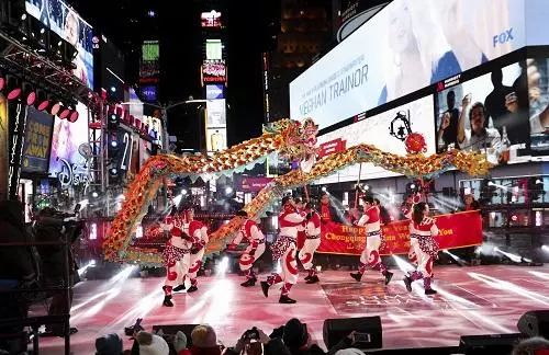 2017年12月31日,在美国纽约时报广场新年倒计时开幕庆典仪式上,来自中国重庆铜梁的演员表演舞龙。当天,纽约时报广场新年倒计时开幕庆典仪式以“山水之都·美丽重庆”为主题,来自重庆的艺人为美国观众上演了铜梁舞龙。