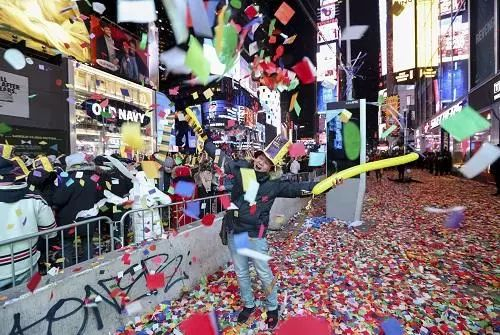 1月1日,一名男子在美国纽约时报广场庆祝新年的到来。2017年12月31日晚,纽约时报广场举行一年一度的跨年庆典。