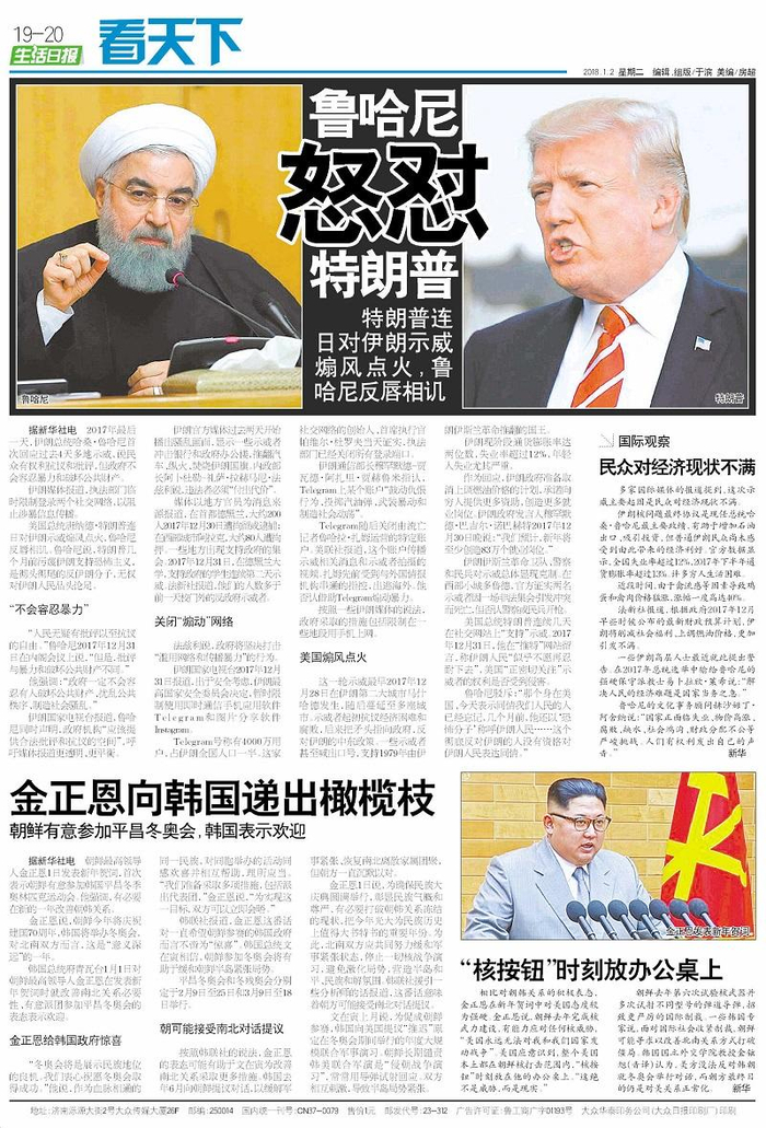 2017年最后一天,伊朗总统哈桑·鲁哈尼首次回应过去4天多地示威,说民众有权利抗议和批评,但政府不会容忍暴力和破坏公共财产。伊朗媒体报道,执法部门临时限制登录两个社交网络,以阻止涉暴信息传播。美国总统唐纳德·特朗普连日对伊朗示威煽风点火,鲁哈尼反唇相讥。