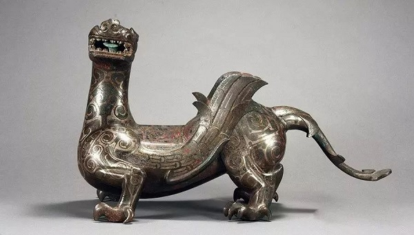 双翼错银铜神兽来自河北省文物研究所,1977年出土于河北平山中山国王璺墓。高24.6厘米,长40.5厘米,铸于战国时期。青铜铸造,错以银纹。兽首头顶两耳如桃,两耳中间有一角后弯,角尖前勾,角两侧卷毛环布。鼻如如意云钩,双目突出圆睁。阔口微张,长舌挺起,齿排若锯。似狮非狮的形象,致微致精的刻画,使神兽富丽而神秘。