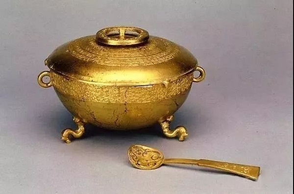 金盏来自湖北省博物馆藏,铸于战国时期,盏:高 10.7厘米,口径 15.1厘米,重 2150克,1978年出土于湖北随州曾侯乙墓。该金盏是目前所见最大最重的先秦金器,代表了这一时期贵金属工艺的成就与特点。其盖面和盏口铸有精细的云纹、勾连雷纹、蟠螭纹等。整器使用分铸法铸造而成,先将捉手、盖、身、足分别铸好,浇铸器身再合范成整体,与当时青铜器铸造方法相同,可见金银器制造受青铜文化影响很深。