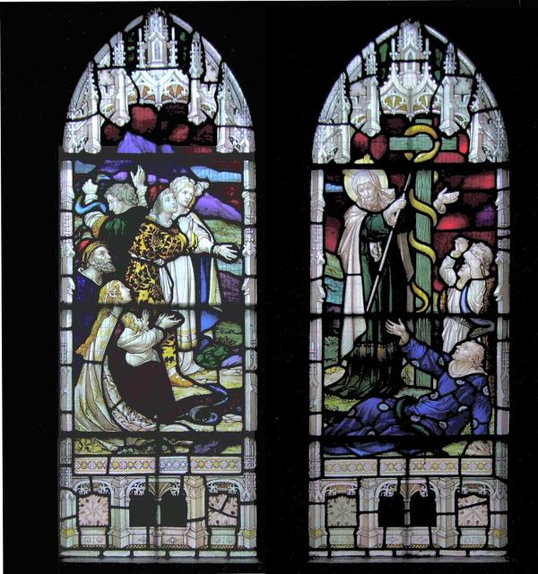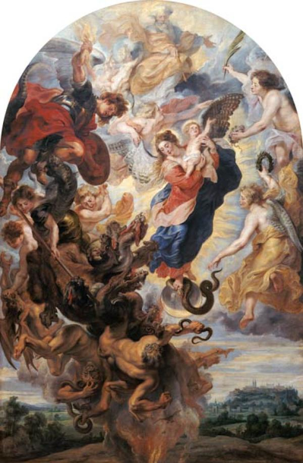 那一天,耶和华必挥起他的巨剑 无情地严惩海龙, 那逃窜的虬蛇,海龙 那蜿蜒的长虫—— 必击杀那头大洋之怪。 Leviathan的毁灭 这屠龙主题在《圣经》中重复多次,有时还特别强调上帝脚踩顽敌的意象(诗91:13): 而你将脚踩狮子和蝰蛇 小狮大蟒通通踏倒。 对以色列的先知来说,这意象既是末日预言,也是政治寓言。例如,耶利米将巴比伦王尼布甲尼撒比作海怪(tannin);以西结把埃及法老描绘成“潜伏在河里的大鳄”(tannin,耶51:34,结29:3)。就这样,众先知拿巴比伦人跟埃及人贬抑仇敌的比喻,回敬了巴比伦和埃及。 所以,希伯来《圣经》用龙比喻造物主的对手、以色列的外敌,正是古代近东通行的政治语汇。与之相关的另一[后圣经]母题,则被后来的基督教继承了:蛇成了恶的化身,引诱乐园里的夏娃(创3:1-15)。或因龙的模样如大蛇,伊甸园的那条蛇,就很容易为龙传统吸收。中世纪的许多亚当夏娃受惑图,都把蛇画作了龙(Palli, cols. 516-24; Debidour, pp. 292-3, 314-7)。 于是,龙作为大恶(即魔鬼)的象征,进入了基督教传统。但这一主题没有出现于福音书和圣保罗书信,而是在《新约》末尾,由《启示录》的作者所阐发。那儿,取自犹太末日预言传统的神与龙之争,占据了异象的中心。《启示录》的龙有七个头(巴比伦神话也有七首龙),与《诗篇》所述,上帝击毙的多头海龙遥相呼应(诗74:13-14): 是你,运大力分开汪洋 大水之上,打碎怪物的脑袋; 是你,砸扁海龙的头颅 将它喂了荒漠野兽。 异象中,这条撒旦之龙的对头,则是圣母玛丽亚(启12:1-9)[此为教会的传统解释;作者引钦定本,拙译据汇校本原文]: 天上忽显出一大异兆:一位妇人,身披太阳,脚踩月亮,头戴十二颗星星为冠。她怀了胎,正在生产,因分娩的阵痛而喊叫。接着,天上又显一异兆:看哪,一条火红的大戾龙!长了七首十角,头戴七顶王冠。它长尾一扫,揽了天上星辰的三分之一,掷落在地。那戾龙站到分娩的妇人跟前,等着诞下孩儿,他好吞吃。而产下的是一男婴,就是来日必以铁杖放牧万族的。倏地这孩儿被提至上帝身边,宝座之上,那妇人却逃进了荒野;那里有上帝给她备好的一个去处,可以供养她,一千二百六十日之久。 于是,大战爆发于重霄,米迦勒率众天使进攻戾龙。那戾龙也纠集自家使者反击,但终于不敌,天上没了他们容身之地。结果大戾龙摔了下来,那条古蛇,又名恶魔、撒旦,那全世界的诱骗者——他被摔在尘埃,带着自家使者一道摔下。 圣母玛利亚 此外,《启示录》的作者还说,他望见天使捉住龙形的恶魔,将它抛下无底深渊,至千年期满,才会释放片时(启20:1-3)。这段描写,情节也类同埃及、希腊的屠龙神话(Merkelbach, cols. 238-9)。于是过去、未来呈现于当下,重演了一趟那个古老的故事:创世神与混沌之战。 ※ 康士坦丁脚踏恶龙的胜利形象,源出于此。皇帝父子一如米迦勒天使长,战胜了异教敌人,在基督的十字架之下,将败龙打落尘埃。十字架击败戾龙,遂成了拜占庭艺术流行的主题。文学上的礼赞,则有四世纪诗人普鲁旦提乌(Aurelius Prudentius)的精彩总结:[罗马]士兵“丢开了战旗,去依附十字架;替代他们肩上从前迎风招展的龙旗的,是那因基督而名扬天下、降伏戾龙的木十字架”(Peristephanon, 1.35-6)。 经过犹太/基督教这一路的改造,龙不再是古代近东宗教里创世之先宇宙大战中的一员;它担起了基督教的末日预言,象征着恶,即人祖最初的堕落之恶——直至基督上十字架受难,恶龙才不得猖獗。 进入中世纪,龙就成了大恶或魔鬼的化身、异端邪说的代表。不过偶尔,它也有模棱两可之处,因为人们往往分不清龙、蛇。虽说恶魔曾化作蛇,引诱夏娃,但上帝惩罚违命的以色列人,让他们遭火蛇叮咬,救命的仍是一条铜蛇:摩西遵旨,将铜蛇悬上了旗杆(民21:6-9)。圣约翰在福音书里解释说,这铜蛇是基督上十字架受难的预象(约3:14-15)。类似的故事,使蛇在中世纪变得具有多重含义,龙的象征也日趋复杂。 摩西悬挂铜蛇 随着基督教的扩张,先在罗马帝国境内,然后又深入“蛮族”部落,基督教教义便碰上了各地的异教信仰和礼拜仪式,并开始互相影响。异教龙于是通过多种途径为基督教传统所同化。途径之一是文学,如希腊神话里的龙或蛇,很早就文学化了,失去了宗教含义。五世纪初,异教作家马可罗布(Macrobius Theodosius)作《农神节》,炫耀他渊博的历史知识,称龙是希腊医神(Aesculapius)和罗马健康女神(Salus)之象征:龙每蜕一次皮,就更新一回力量,如同太阳月亮,长生不老(Saturnalia, 1.20)。《农神节》在中世纪早期颇风行,僧侣抄写阅读此类文学作品,便熟悉了传统知识。 日耳曼人的宗教,则有自己一套龙传统和象征。龙在日耳曼文化中可代表海洋的毁坏力。九、十世纪间威震整个西欧海岸的北欧海盗(Vikings),喜欢在船首雕一个面目狰狞的龙头。他们的雷神(Thor)的致命对手,是躺在人世底下,环绕大地的猊龙。待到末日来临,它将卷起滔天巨浪,人神俱毁(Davidson, pp. 89, 138-9)。相传,龙是墓穴及埋在里面的宝藏的看守。早期俗语最著名的史诗《贝奥武甫》的英雄,就是为屠龙而牺牲的。贝奥武甫的扈从们在英雄的尸身旁找到了被斩杀的怪物(Beowulf, ll. 3038-46): 他们先已看见那头奇形怪状的东西 凶顽的大蛇,躺在对面地上。 这火龙一身吓人的斑斓铠甲 全被烈火烧黑了;伸展开去 足足有五十英尺长。从前 它曾经恣意游行黑夜的天空, 时而掉头降落,找寻它的