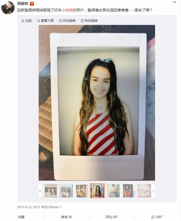 张榕容在个人微博上晒童年照。4月10日是她生日。
